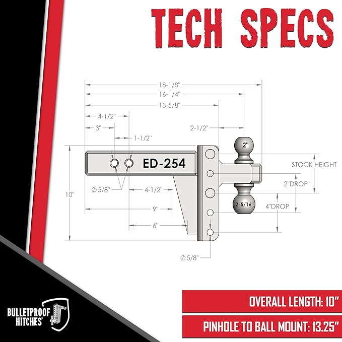 - Adjustable Trailer Hitch: Easily adjustable drop hitch designed for swift adjustments in under 15 seconds; ED254 model measures 10" in overall length and offers 4" of usable drop and 3 ride heights