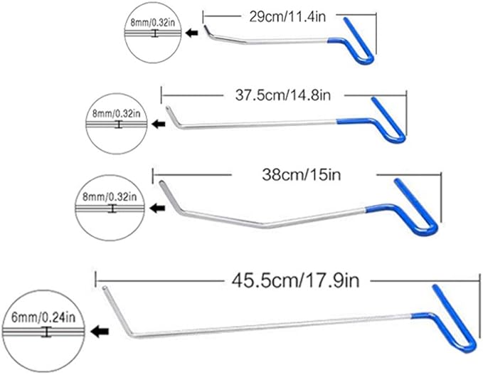 - 【How to Use】 First use the light reflector board to detect the deformation.This process helps you properly push up the metal; Then use the metal rods (choose one tip shape that fit most) to move dents outward from the inside or from under the panel. Not every one can do the work well,so we suggest these tools best be used by people with paintless dent repair skill experiences.