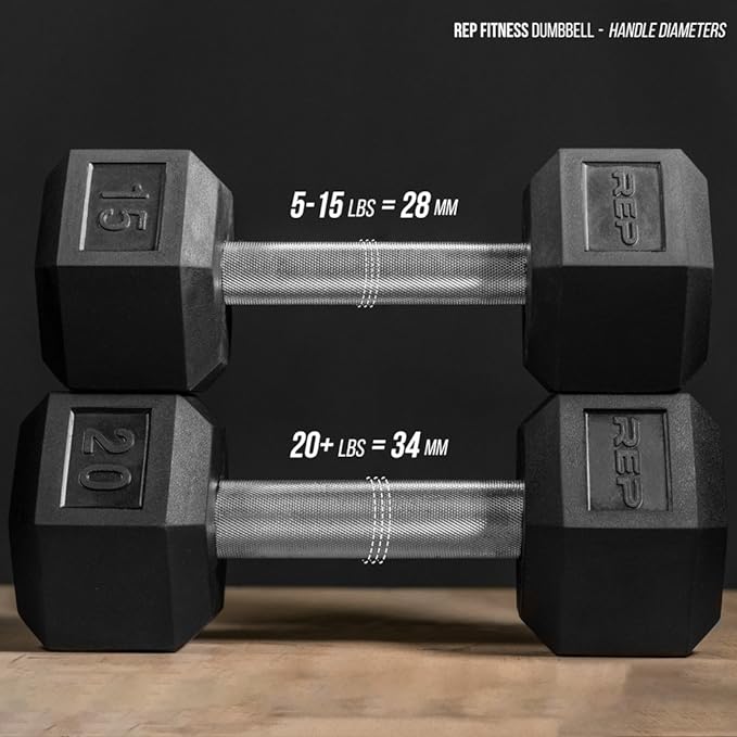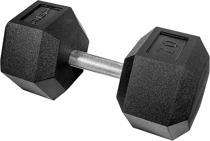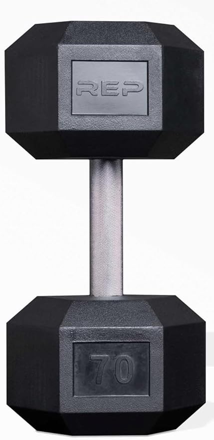 Rep Fitness Rubber Hex Dumbbell(s) - Singles (55LB +) and Pairs (5LB - 50LB) - Low Odor, Fully Knurled Handle