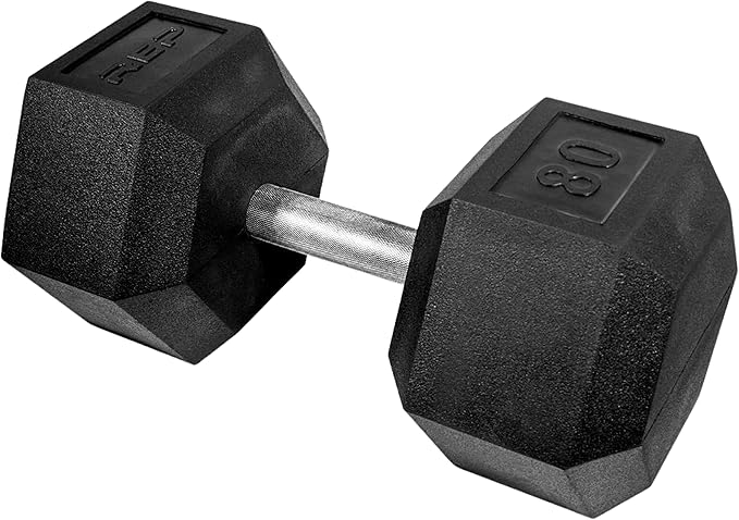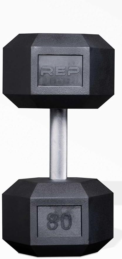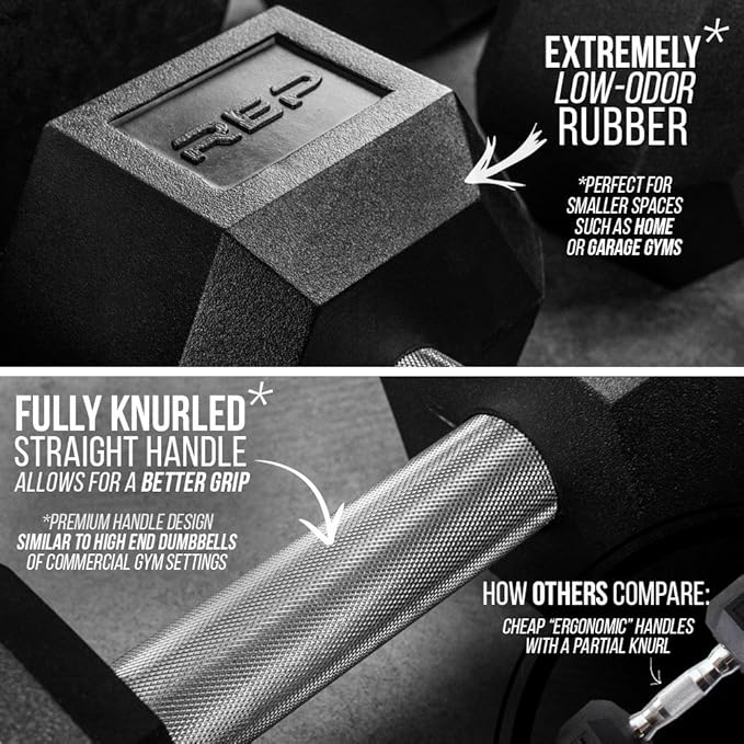 Rep Fitness Rubber Hex Dumbbell(s) - Singles (55LB +) and Pairs (5LB - 50LB) - Low Odor, Fully Knurled Handle