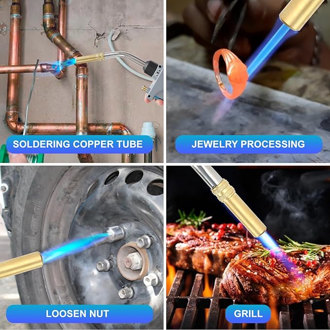 - One-Click Ignition with Safety Lock:The auto trigger-start ignition of this propane torch head with igniter makes it super easy to ignite and extinguish the flame with just one click. The instant ON/OFF design ensures you don't need to turn the adjustment knob every time. Additionally, a safety lock is designed to prevent accidental ignition, making this map gas torch kit user-friendly and safe.