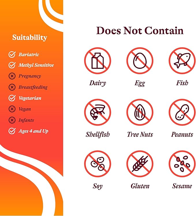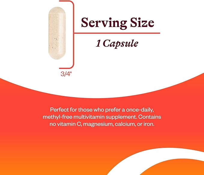 - Methyl-free: Formulated without methylcobalamin or methylfolate to support those sensitive to methylated nutrients, and without calcium, vitamin C, magnesium, choline, or iron