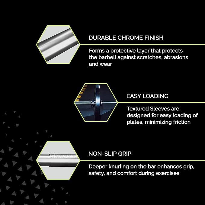 - 【 ERGONOMIC DESIGN 】: Our 7FT training bar weighted 44LBS with a load bearing capacity of 1500LBS features a comfortable grip with 1.5mm deep diamond-knurled handles that provide a secure and non-slip grip during intense training sessions. The shaft and sleeves have a durable chrome finish that provides protection against corrosion and oxidation over time, as well as a stylish look in your professional gym or home gym.
