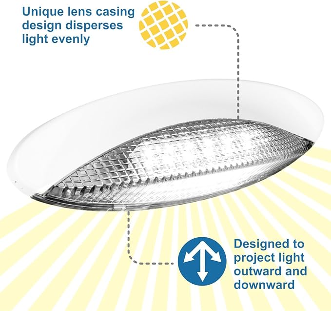 - Features: Easily removable white trim to match your RV and protect the mounting hardware. This light also features 18 individual LED bulbs producing an impressive 220 lumens for clarity and functionality allowing you to enjoy warm summer nights.
