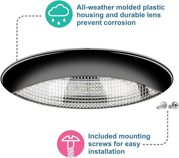 - Features: Easily removable black trim to match your RV and protect the mounting hardware. This light also features 18 individual LED bulbs producing an impressive 220 lumens for clarity and functionality allowing you to enjoy warm summer nights.