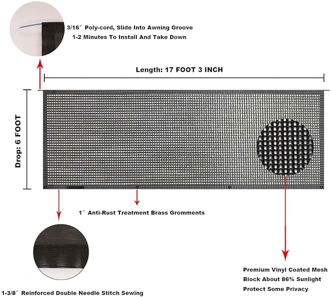 Tentproinc RV Awning Sun Shade Screen 6' X 17' 3'' (Fit for 18' Awning) Mesh Sunshade for RV Awning Sunscreen Camping Trailer Motorhome Awning Shade Screen - 3 Year Warranty (Black)