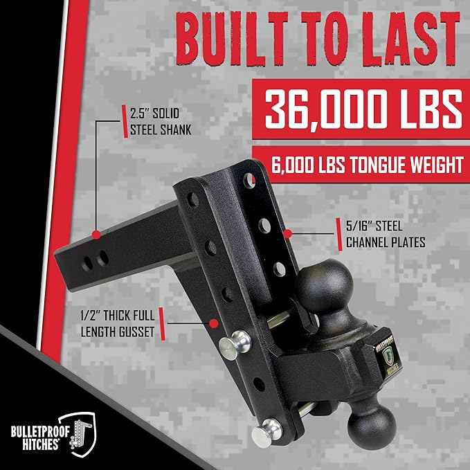 - Compatible with a Wide Range of Vehicles: BulletProof Extreme Duty Trailer Hitches fit various vehicles with ease; this heavy duty trailer hitch is Class 5 and fits 2.5" receivers with a 36,000 lb. max towing capacity and a 6,000 lb. tongue weight capacity