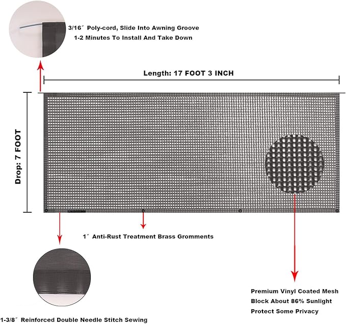 Tentproinc RV Awning Sun Shade Screen 7' X 17' 3'' (Fit for 18' Awning) Mesh Sunshade for RV Awning Sunscreen Motorhome Camping Trailer Awning Screenshade Block UV Glare - 3 Year Warranty (Brown)
