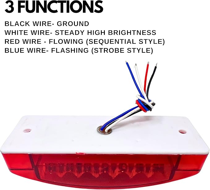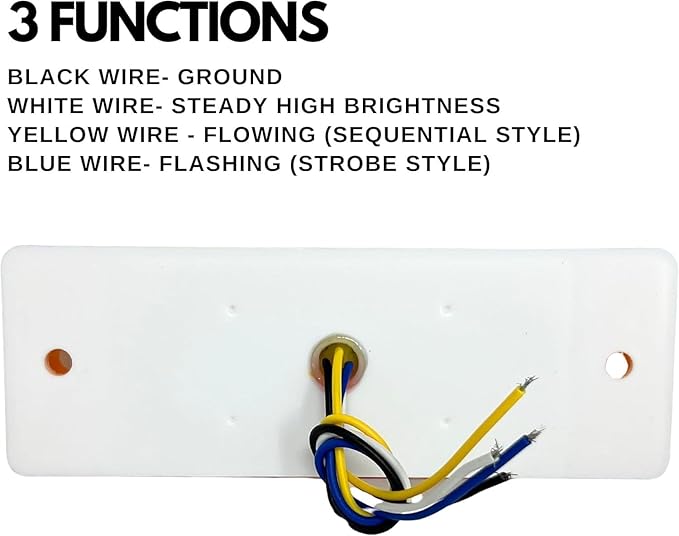 - Multiple Lighting Options- Light is supplied with 4x 5" wire leads, and supports three different functions. Black Wire- Ground, White Wire- Steady High Brightness, Yellow Wire- Flowing Style Sequential Turn Signal, Blue Wire- Flashing/Strobe. (Emergency/construction vehicle use.)