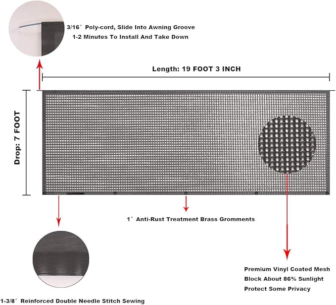 - HOW TO ORDER - Actual finished Fabric Measurement of 7'X19'3'' is 7 FT drop by 19 FT 3 INCH length, it's fit for 20 FT RV Awning (The RV Awning using Center of Arm to Center of Arm measurement), and fits the most of awning brands such as Dometic (A&E), Carefree, Lippert, Fiamma, Solera, etc.