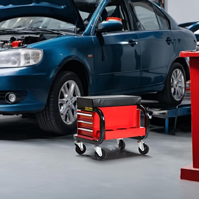 Tool Box Built-in Creeper Seat, Garage Shop Roller Seat, 3 Drawers Heavy Duty Tool Chest with 4 Rolling Casters-350 Lbs Capacity