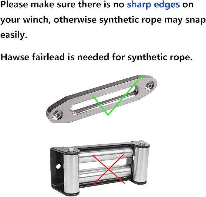 - Upgrade your winch with stronger synthetic winch rope than traditional steel cables. Aluminum Hawse Fairlead is needed. Synthetic Rope may be snapped easily with rollers. Not recommend for plowing(may fray easily).