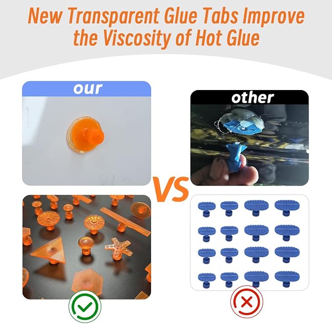 - Note 2: Due to the cold weather, hot melt glue may be prone to cold adhesion, resulting in poor bonding. It is recommended to use a heat gun to warm the dent area of the car before applying the glue. After applying the glue, quickly press it onto the car surface. Additionally, to ensure optimal performance of the adhesive, make sure the surface to be bonded is free of moisture or dust.