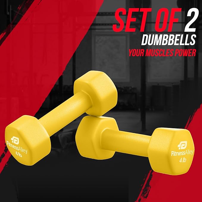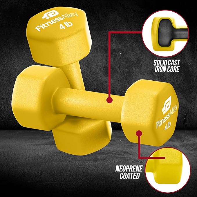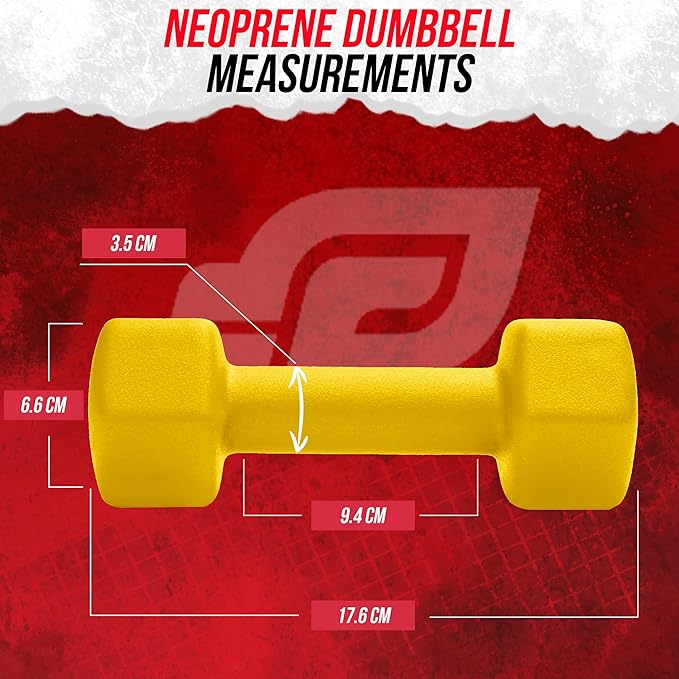 - The box includes 2 Dumbbells that comes in 4LB Size and Yellow Color. Construction is of cast iron, which is of superior quality along with neoprene gripping that allows lifting of heavyweights simpler and easier