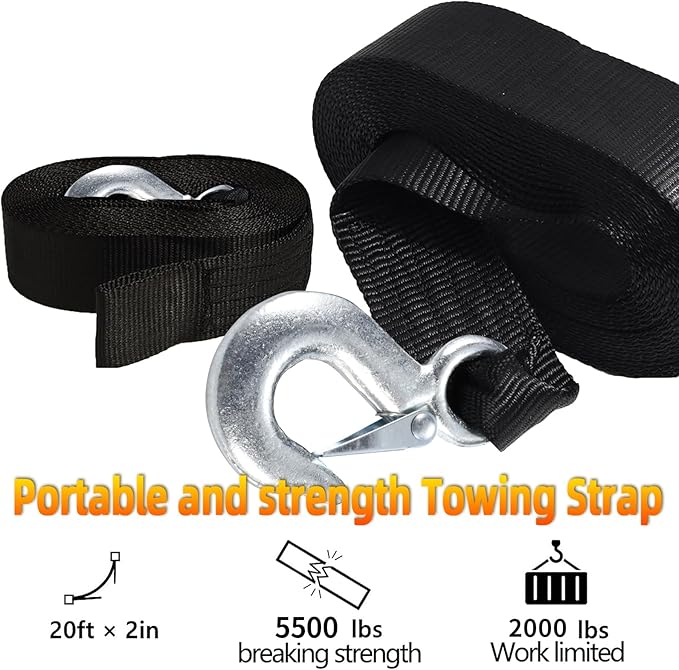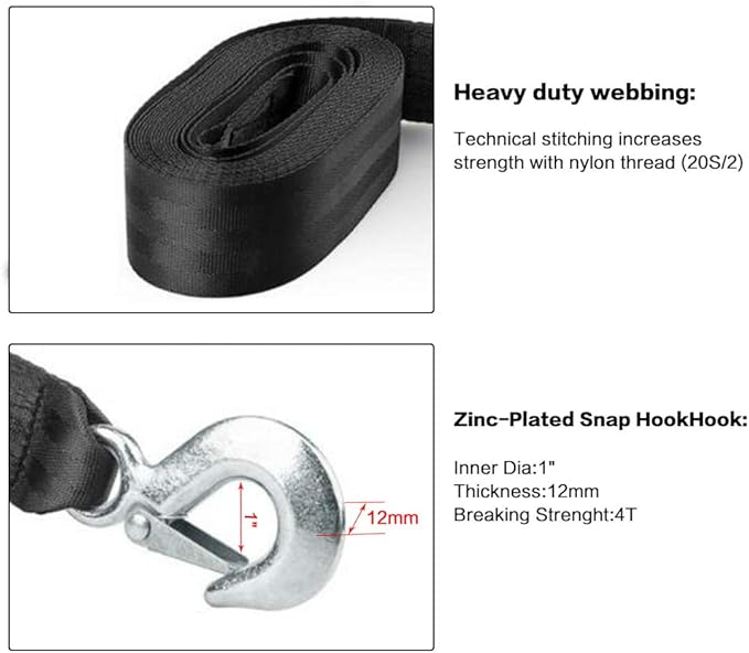 - WORKING CAPACITY:Our 20 foot boat winch strap with a 5000-pound load capacity,The strap is made of polyester and comes with a safety snap hook for secure towing.