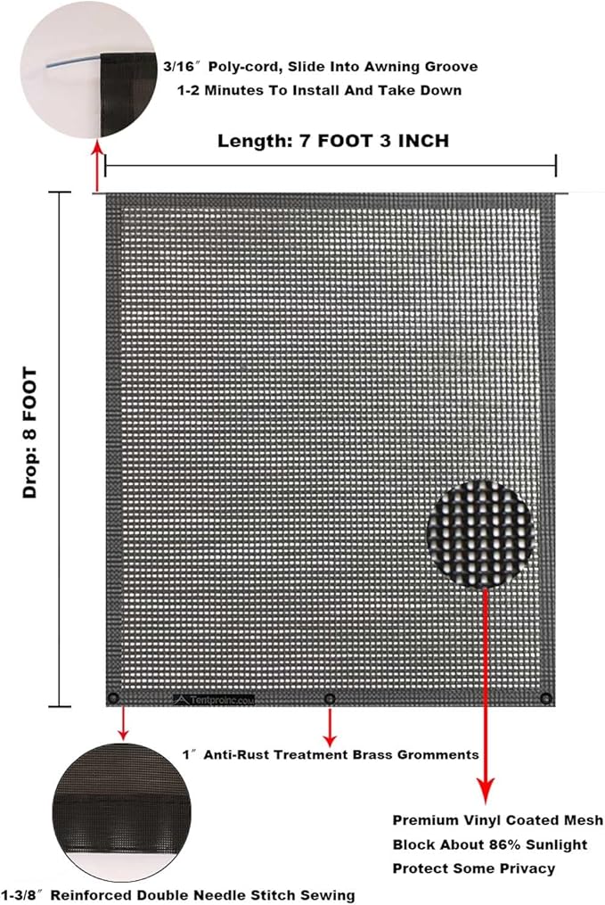 Tentproinc RV Awning Sun Shade Screen 8' X 7' 3'' (Fit for 8' Awning) Mesh Screen Sunshade Complete Kits Motorhome Camping Trailer Awning Sunscreen UV Sun Blocker - 3 Year Warranty (Black)