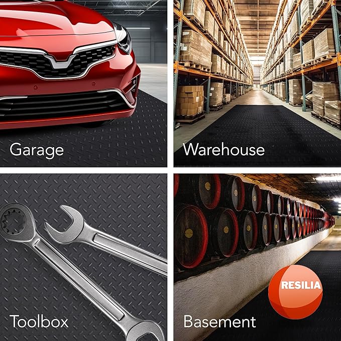 RESILIA Heavy Duty Garage Floor Runner & Protector Mat - Slip Resistant Diamond Plate PVC Mats - Water, Spill, & Stain Resistant, Black (4 feet x 10 feet), Made in The USA