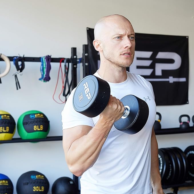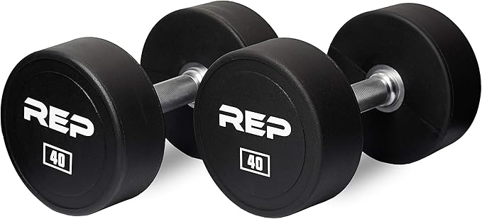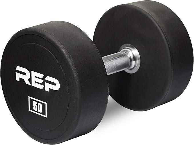 REP Fitness Urethane Coated Round Dumbbells, 5 to 100 lbs, Singles or Pairs, With or Without Rack, Steel Core, Rubber Encased, Chrome Handles, Professional Weights for Home Gym Strength Training