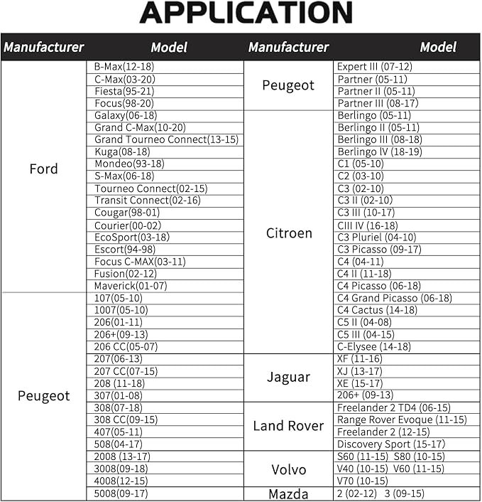 - Compatible with Vehicle: for Focus (2004-2008); for Focus C-Max (2003-2008); for Mondeo (2007-2008) 1.6 Ti-VCT 16V (HXDA) Diese engines; for Duratorq Fiesta / Courier (2000-2006); for Focus (1998-2006); for Focus C-Max (2003-2008); for Mondeo (2007-2008); for Tourneo Connect (2002-2008); for Transit Connect (2002-2008); for Fusion (2002-2008); for S-Max (2006-2008); for Galaxy (2006-2008); Compatible with 2012 Ford B-Max 1.4L Duratec-16V; Compatible with 2015 Ford C-Max 1.5L EcoBoost