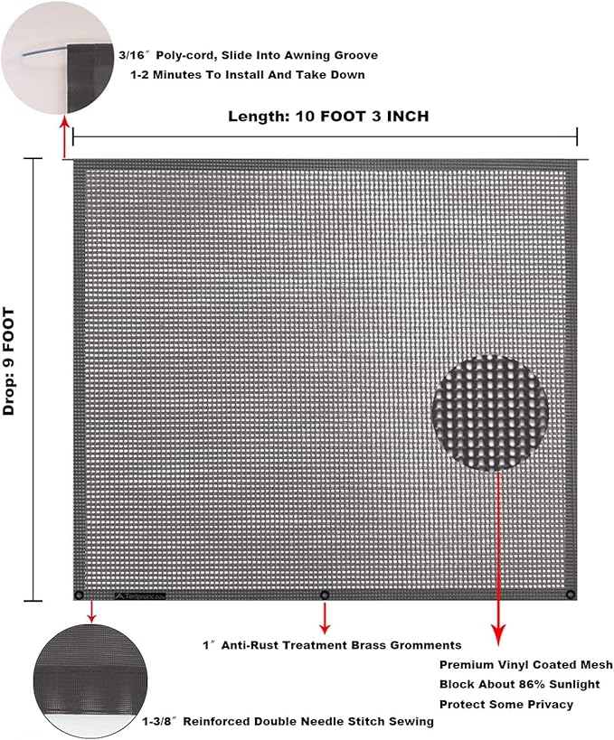 Tentproinc RV Awning Sun Shade Screen 9' X 10' 3''(Fit for 11' Awning)- Mesh Sunshade for RV Awning Sunscreen Motorhome Camping Trailer Awning Shadescreen Block UV Glare - 3 Year Warranty (Brown)