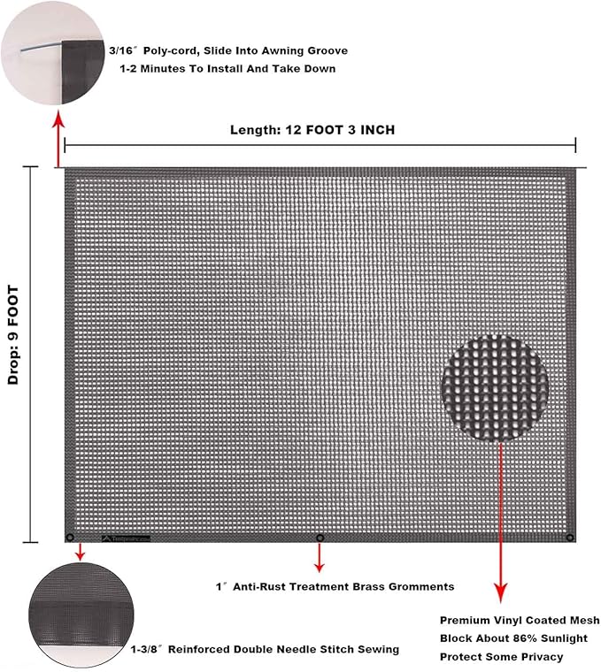 Tentproinc RV Awning Sun Shade Screen 9' X 12' 3'' (Fit for 13' Awning) Mesh Sunshade for RV Awning Sunscreen Block UV Glare Motorhome Camping Trailer Awning Shadescreen -3 Year Warranty (Brown)