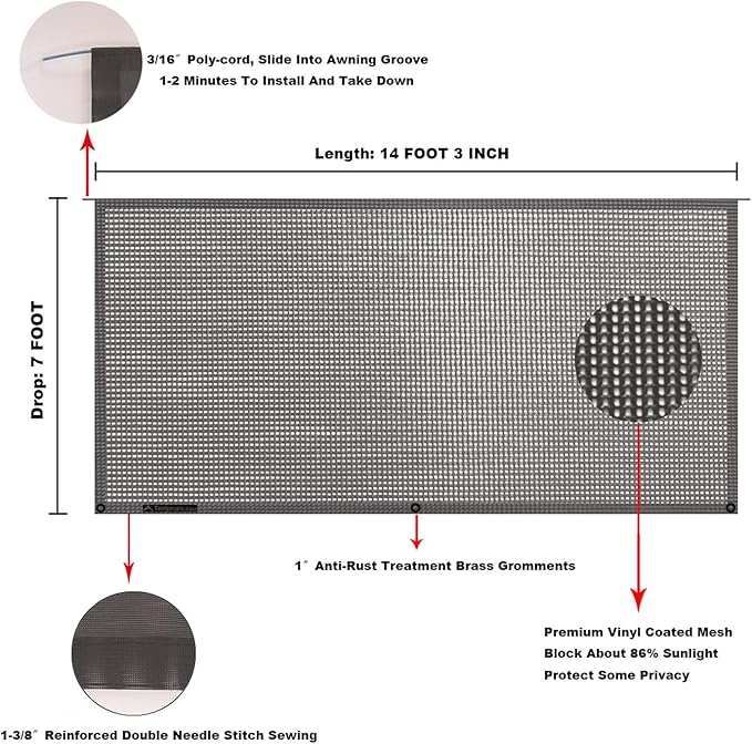 - UV BLOCK & OPEN VIEW ¨C Used as front RV awning, blocks about 86% of UV to protect our skin and eyes. Meanwhile offers a wide view.