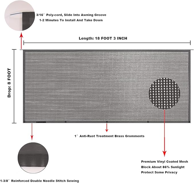 - UV BLOCK & OPEN VIEW - Used as front RV awning, blocks about 86% of UV to protect our skin and eyes. Meanwhile offers a wide view.