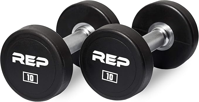 REP Fitness Urethane Coated Round Dumbbells, 5 to 100 lbs, Singles or Pairs, With or Without Rack, Steel Core, Rubber Encased, Chrome Handles, Professional Weights for Home Gym Strength Training