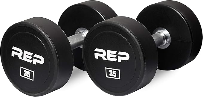REP Fitness Urethane Coated Round Dumbbells, 5 to 100 lbs, Singles or Pairs, With or Without Rack, Steel Core, Rubber Encased, Chrome Handles, Professional Weights for Home Gym Strength Training