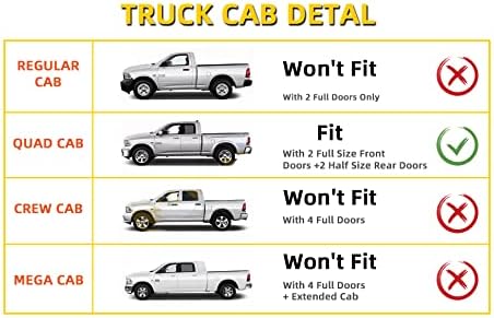 - Fitment: Compatible with 2009-2010 Dodge Ram 1500 Quad Cab (AKA Extended Cab); 2011-2018 Ram 1500 Quad Cab (AKA Extended Cab). Please Note Quad Cab Has Half Size Rear Doors. These Will Not Fit Crew Cab With 4 Full Size Doors