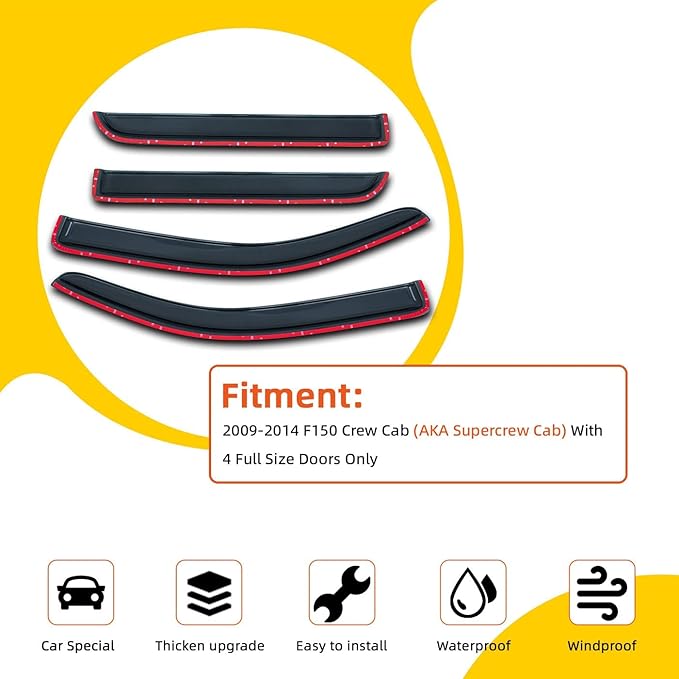 Window Visor Rain Guards Compatible with 2009-2014 Ford F-150 SuperCrew & Crew Cab Smoke Window Wind Deflector Vent Visors for Trucks Accessories Outside Mount Tape-On 4 Pieces 10 11 12 13