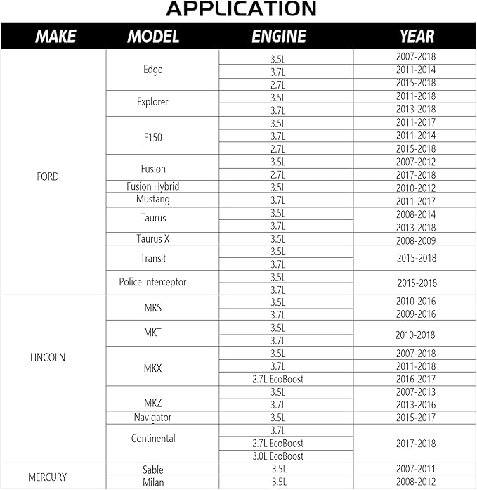 - Fitment Vehicle: Fit Ford V6 3.5L & 3.7L Cyclone Engines, for Ford Edge, Explorer, F150, Flex, Fusion, Fusion Hybrid, Mustang, Taurus, Police Interceptor; for Lincoln MKS, MKT, MKX, MKZ, Navigator; for Mercury Milan, Sable, Replace 303-1248 303-1530 OTC 6682