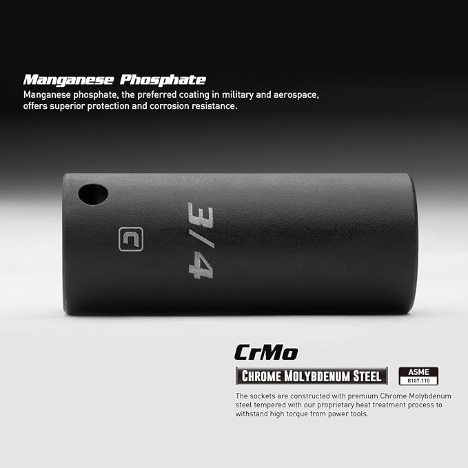 - Expertly coated with manganese phosphate, the preferred coating in military and aerospace, which offers superior protection and corrosion resistance compared to black oxide coating on other impact sockets