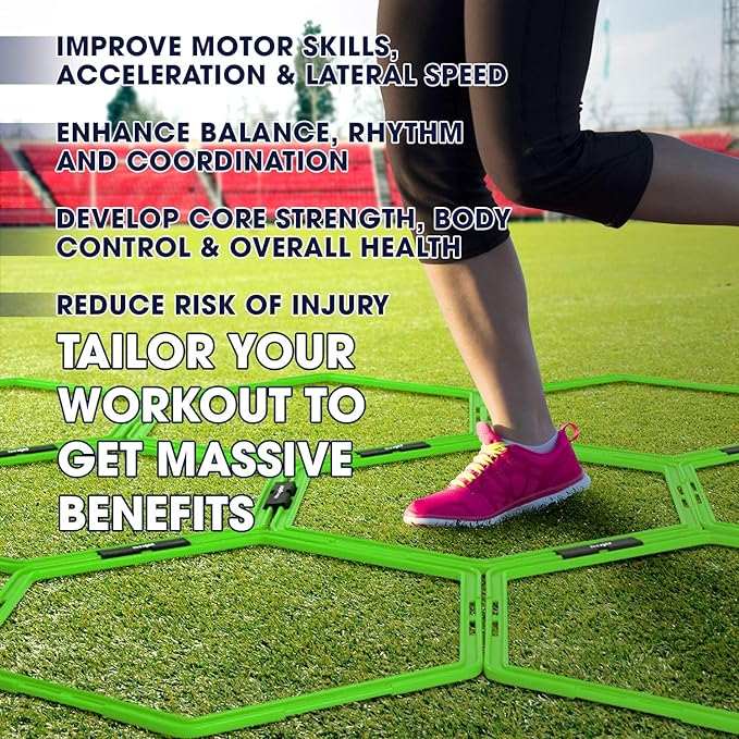- ULTRA-DURABLE HEXAGONAL SPEED: Heavy-duty plastic agility training equipment is tough enough to handle countless sessions and withstand the inevitable stomps and kicks; Football ladder enhances speed, agility, and footwork.