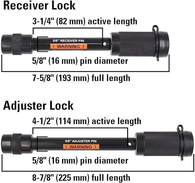 - ADJUSTER PIN FITS MOST ADJUSTABLE HITCHES - Extra long 5/8" locking hitch pin with 4-1/2" span, fits most adjustable hitches, such as fit for CURT channel style adjustable hitches 45900, 45901, 45902 and adjustable pintle hooks 45907, 45908. * This lock DOES NOT fit for FASTWAY adjustable hitches. 5/8" receiver pin with 3-1/4" span, fits Class III/IV hitches with 2" and 2-1/2" receivers. * Before purchase, please verify all dimensions of your hitch, to get a great fit of the hitch lock pin