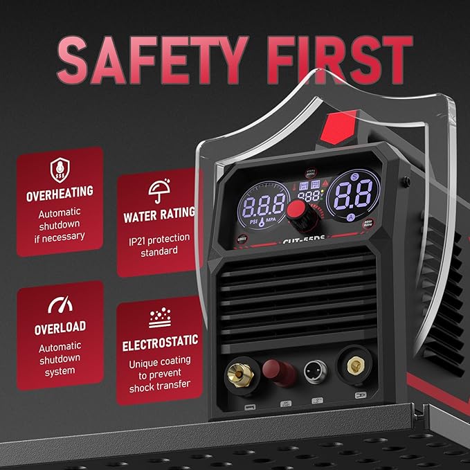 - POWERFUL CUTTING CAPACITY: Featuring a 20-55A current output, it delivers deep cutting thickness. Ideal clean cut: 19/64''@110V,25/64''@220V, max cut: 9/16''@110V,17/24''@220V. Uses non-hazardous compressed air to cut stainless steel, alloy steel, mild steel, copper, and aluminum.