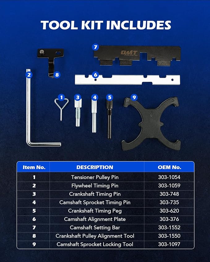 - COMPREHENSIVE SET: Included in the convenient storage box are camshaft sprocket and crankshaft pulley alignment tools, a camshaft alignment plate, a camshaft setting bar, as well as all the pins necessary for locking other various parts of your engine