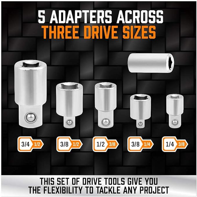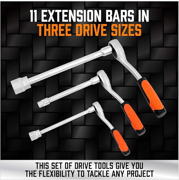 - 20-Piece Extension Bar Set, 11pc extension bar 1/4-inch drive (2, 3, 6 inches); three 3/8-inch (1-3/4", 3, 6, 10 inches); three 1/2-inch (2, 3, 6, 10 inches). 3pc universal joint: 1/4"Dr, 3/8"Dr, 1/2"Dr. 5pc coupler and 1 shank adapter.