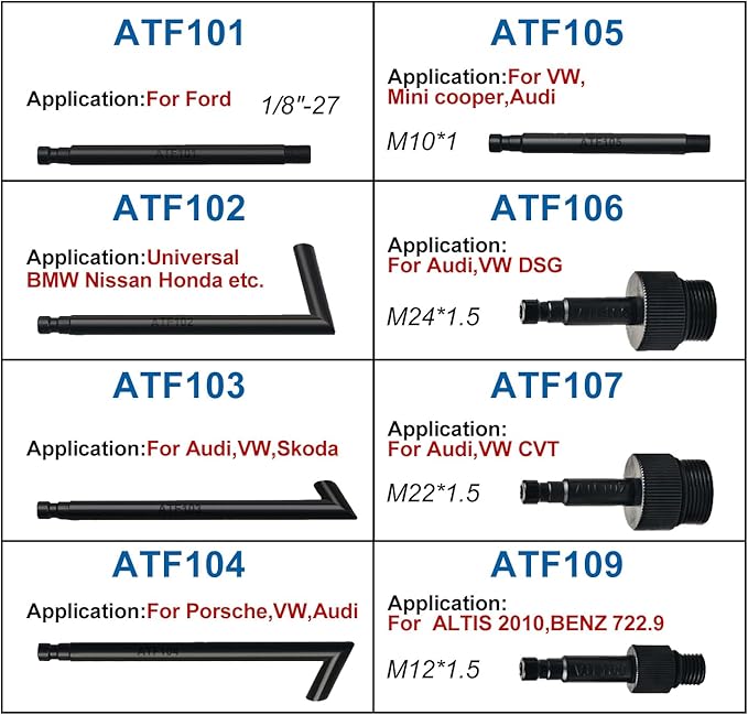 - Packing List: The transmission fluid pump include a 3 liter fluid container with pump handle cover, a pressure gauge, a pressure release cap, a tube, and 8 transmission fluid adapters