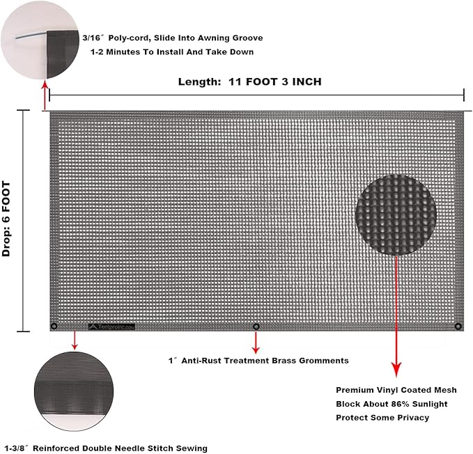 - SUN BLOCK & OPEN VIEW - Tentproinc RV Awning Front Shade block the sun light away from your RV patio FRONT direction, cut about 86% of UV to protect our skin and eyes, but meanwhile the mesh fabric shade with airflow offers a wide view experience and provide privacy while some meters away. LOWER TEMPERATURE - provides you a roomy and cozy shade place. Enjoy your time comfortably even in crazy hot days, 15~25 F degree will be down immediately.