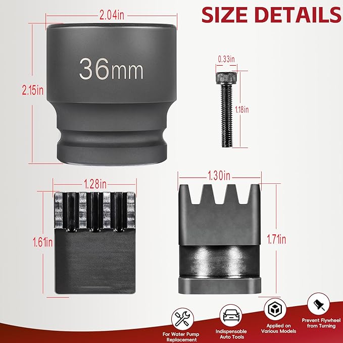 - 36mm 12-Point Socket---Use 36mm 12-point socket with 3/4" square drive to remove harmonic balancer bolt and re-torque on installation. 36mm 12 point socket can also be used on axle.