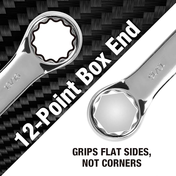 - 12-point box end doubles the access angles of a 6-point and is offset 15 degrees to create clearance so you can securely grip the wrench without busting your knuckles – also letting you apply more torque to the fastener you’re working on. Box end opening is designed to grip flat sides of fastener heads, not corners, to prevent round-off