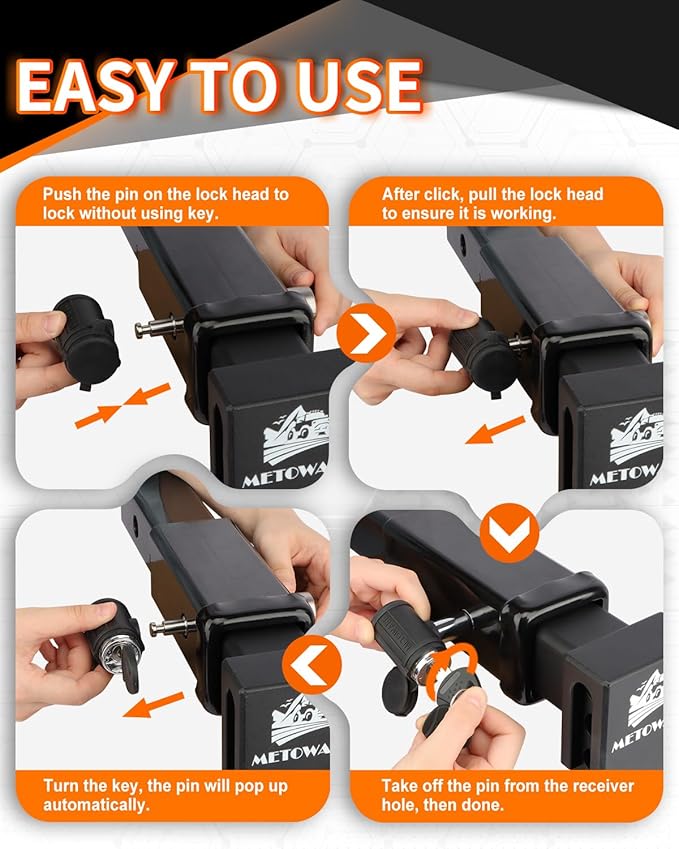 - [Weather Resistance] The key slot cover of our trailer hitch lock with weather resistance keeps the keyhole away from moisture and dust. The dustproof and waterproof lock pin is more durable.