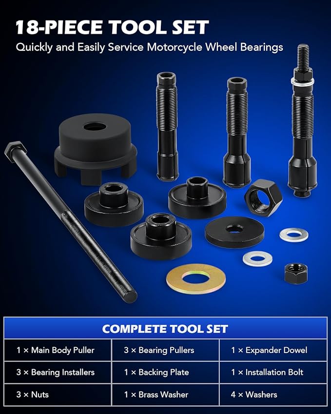 - Inclusive Set: Aside from your wrench, this wheel bearing kit provides everything you need—pullers, bolts, plates, & dowels—to service your machine's wheel bearings, saving you time and money