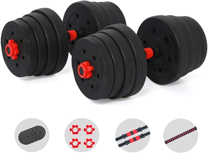 - 【What’s Included】 : All accessories will be: connector x1, dumbbell bar x 2, Nuts x 4 , 2.5 kg dumbbell tablets x 4 , 2 kg dumbbell tablets x 4, 1.5 kg dumbbell tablets x 4, 1.25 kg dumbbell tablets x 4