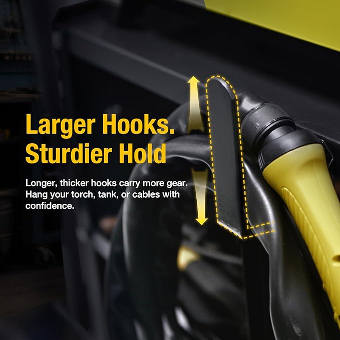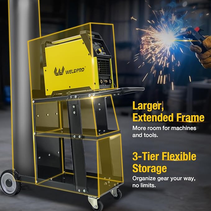 - COMPATIBILITY FOR WELDPRO WELDERS: Designed specifically for Weldpro welders, this cart features two side hooks for convenient cable storage. The bottom shelf accommodates various Weldpro models including MMA75/160GD/200GD/CUT40H/40NH/416GD, while the middle shelf is ideal for storing essential welding accessories. Additionally, the cylinder rack includes top and bottom strapping points to securely hold up to a 125CF gas bottle