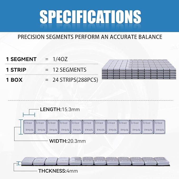 - Specification: Gray wheel weights, 1/4 (0.25 oz),Total Weight = 72 oz. 1 box=24strips = 24strips = 288segments = 72oz. Precision segments perform an accurate balance