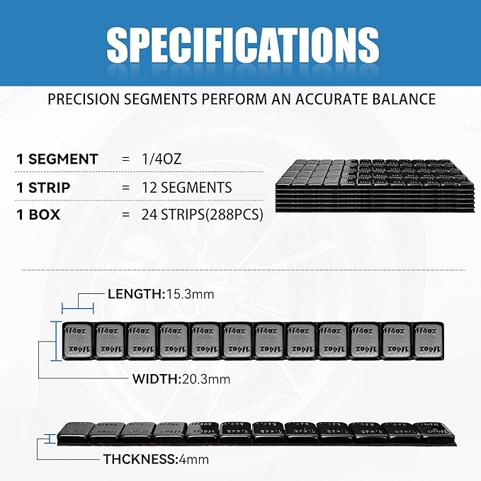 - Specification: Black Weights, 1/4 (0.25 oz)/box,Total Weight = 72 oz. 24strips In total 1 boxes = 24strips = 288segments = 72oz. Precision segments perform an accurate balance