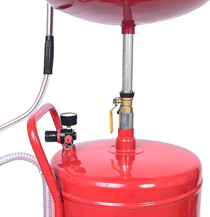 - 20-Gallon Tank Package Includes 1x 20 Gallon Oil Drain, 1x Regulator & 15" Diameter Funnel; 1 X Evacuation Hose with Nozzle