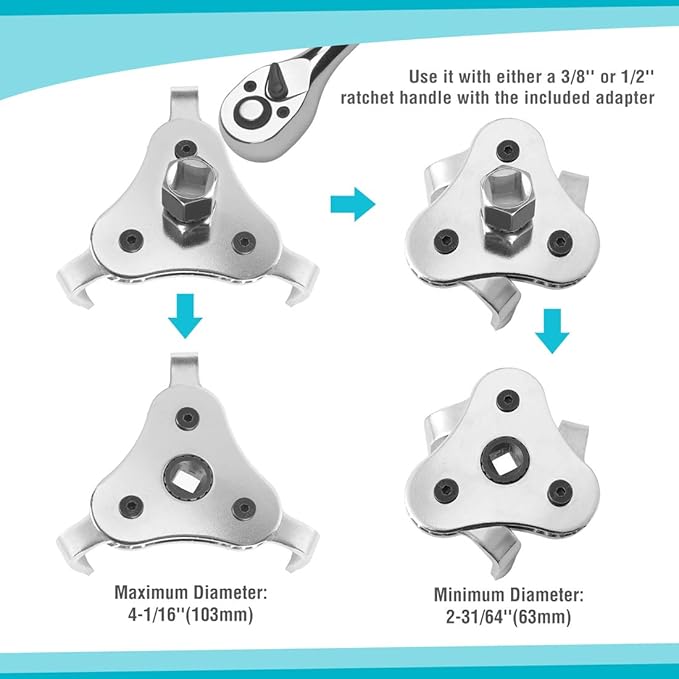 - The 3-JAW 2-WAY Oil Filter removal wrench adapts to most oil filter diameters from 63 to 103 mm, enabling removal even on smooth and oil-covered surfaces. Use with 3/8 " or 1/2 " ratchet handle(Not included)